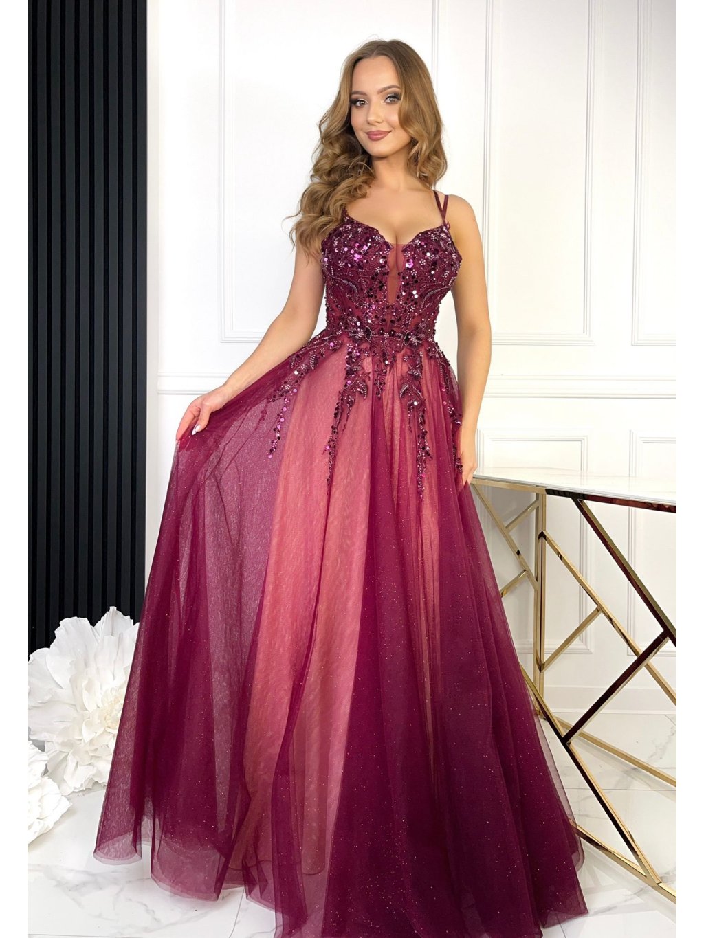 V šatech Hortens se proměníš v královnu noci. Vrstvený tyl a třpytivá výšivka s korálky vytvářejí efekt záře z jiného světa. Dokonale padnoucí živůtek s hlubokým výstřihem ve tvaru srdce podtrhuje dekolt a zároveň dodává šatům nádech romantiky.